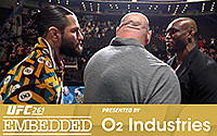 On Episode 5 of UFC 261 "Embedded," Jorge Masvidal and Kamaru Usman stand face-to-face in front of a large crowd.